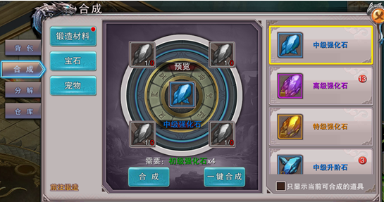 1、在合成系统中,可将低等级的道具合成为更高等级的道具。