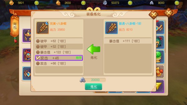 优质装备带有附加属性,透过装备炼化,可将不需的附加属性转移至所用装备上,进而增强装备属性。然则,炼化会随机吸收一条属性,若运气不佳吸取不良属性,可花费少量绑定元恢复至原属性。