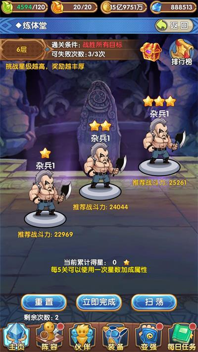 玩法内容:炼体堂主要以推图为主,每个关卡设有简单、普通、困难三种难度,分别可获得1星、2星、3星的评价。每种难度下均有推荐战力,玩家可根据自身当前战力选择适合的难度,通关四个关卡后可挑战一位BOSS。在此,玩家可消耗在之前关卡中积累的星数,以获取属性加成,助力你的闯关之旅更加顺畅。