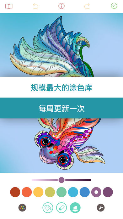* 应用内提供规模最大的作品集(包含2400多幅专业绘画作品),供您尽情涂色
