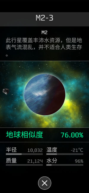 奥伯斯的电脑系统会侦测星空中可疑行星,提供大致位置信息,玩家根据资料分析,深入搜索行星,锁定目标后进行详细分析,内容包括行星自转速度、大气层、气候、水域分布、生命迹象等。