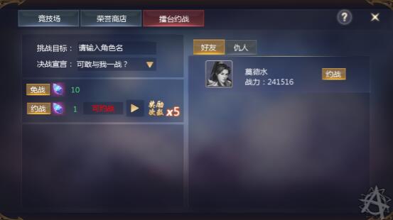 在擂台约战界面选择在线好友或仇人直接发起约战