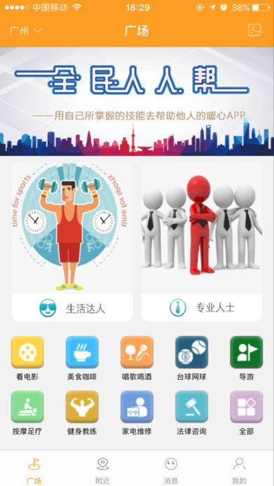 全民人人帮版服务宗旨在于充分利用闲暇时光,提供跑腿办事、球类教练、律师咨询、心理咨询、减肥指导、健身教练、美食品鉴、电影品鉴、上门SPA等多样化服务。