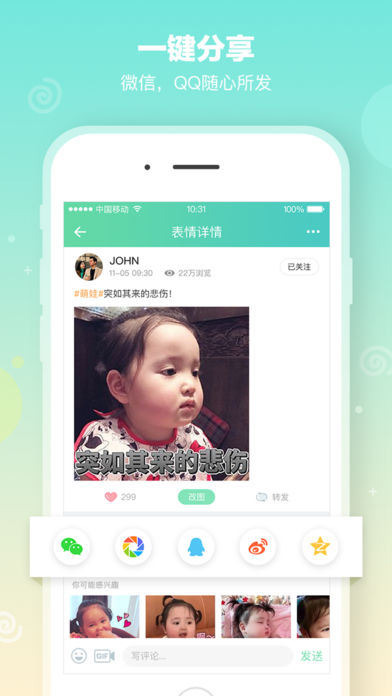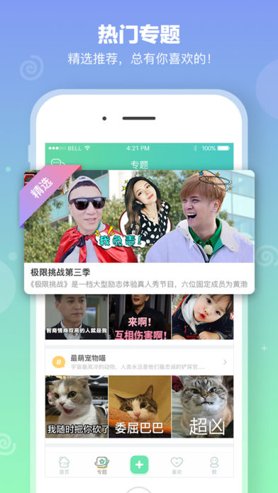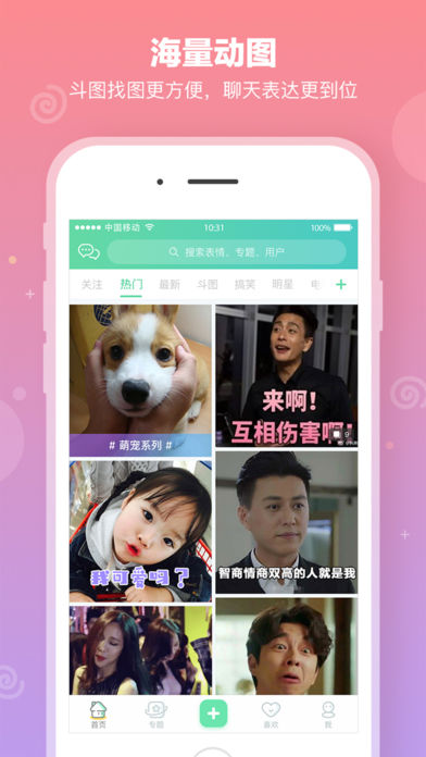 【海量表情】GIF,涵盖斗图、搞笑、明星、电影、电视剧及综艺节目,紧跟潮流,展现当下最火的表情包,每日更新,ヾ(o◕∀◕)ノ每一张都让人眼前一亮,更有专题表情,绝不再担心和他人表情雷同;