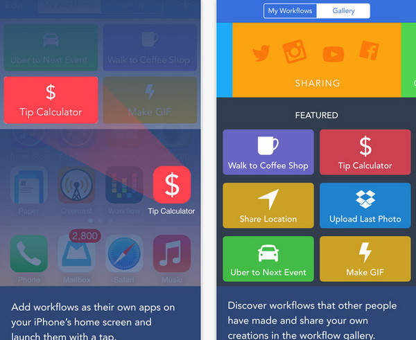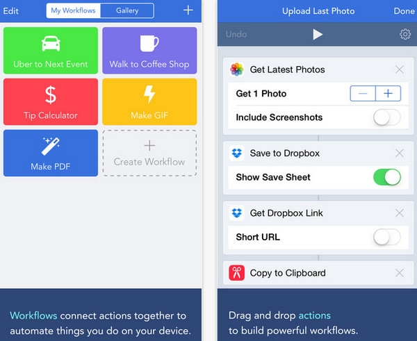 Workflow app是一款超越Launch Center Pro的强大工作流软件,操作简便,界面友好且直观。它使极客们能够充分挖掘iPhone的潜能,若您是iPhone的重度用户,便会发现,借助Workflow iOS版,iPhone的使用空间无限广阔。