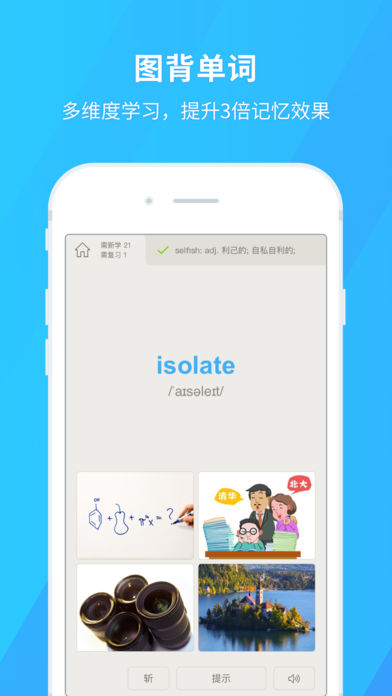 人类对图像的记忆远胜于。因此,每个单词都配以生动的图像,帮助你与真实环境建立深刻的联系。