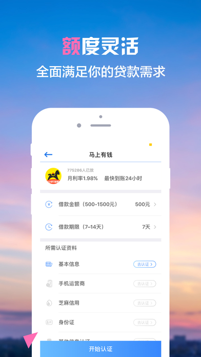 马上有钱官方苹果手机版,是当前国内最热门的小贷平台之一。最高可贷款三万元,当然,这些额度需要逐步累积。这款平台致力于为用户提供全方位的帮助,有需要的用户赶紧下载体验吧。