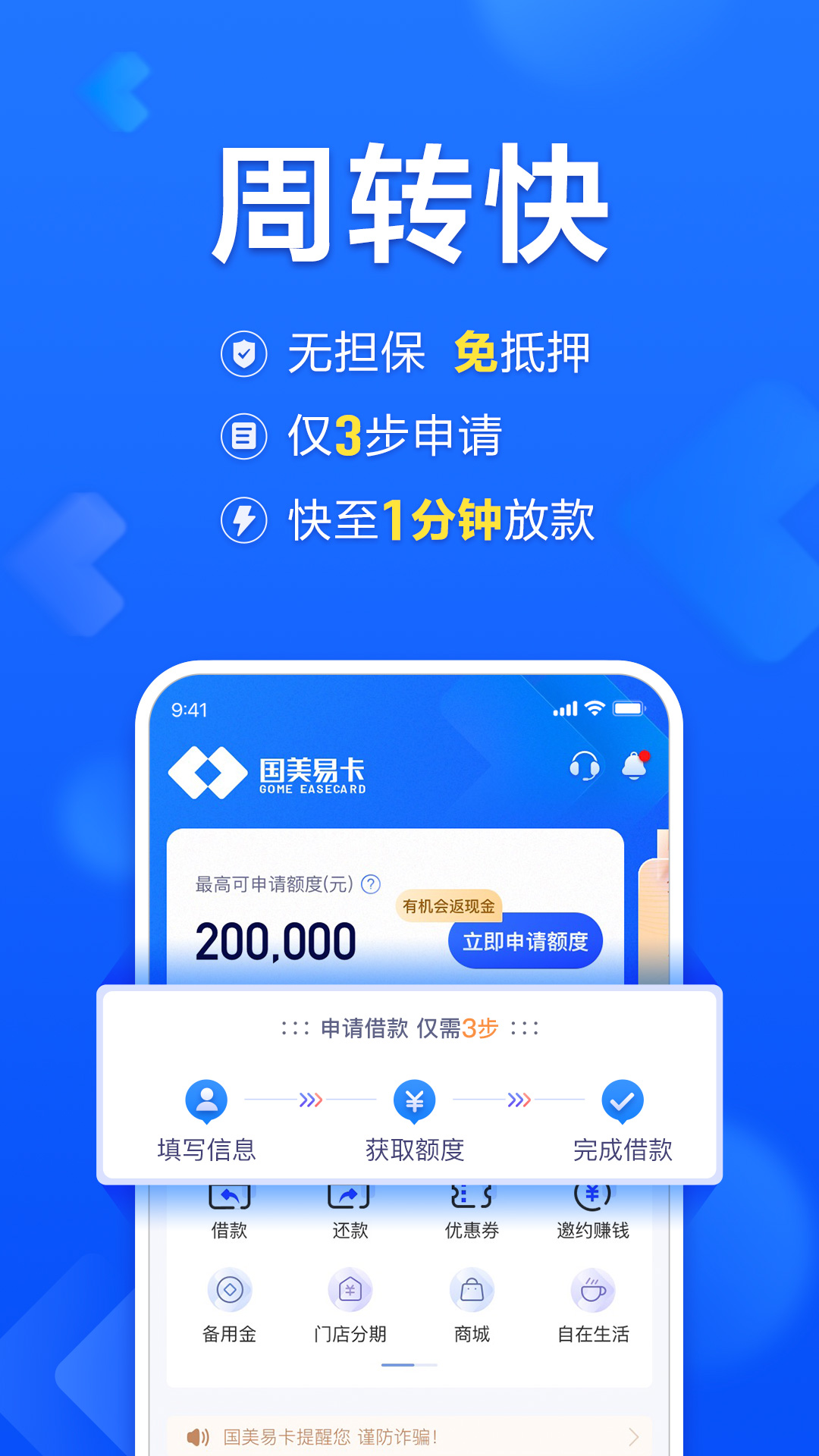 3、放款迅速:线上自动审核,最快可在3分钟内放款。