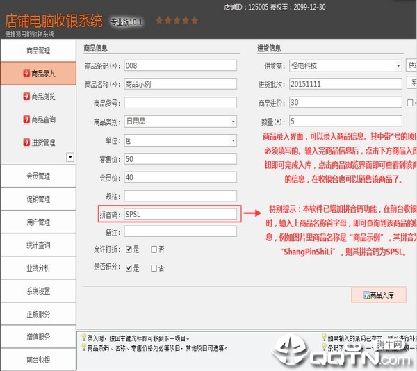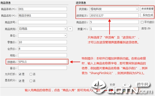 点击“商品入库”,弹出提示,该商品已录入到收银系统中,可以继续录入下一件商品了。