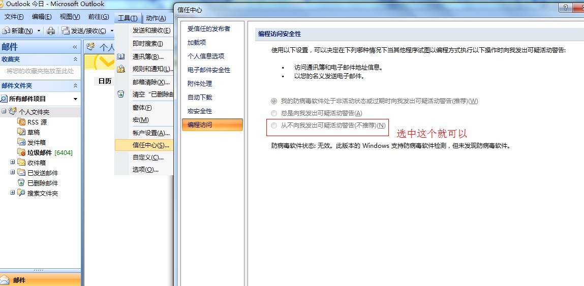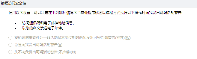 如果想消除OutLook每次都弹出的“允许和拒绝”的警告信息,office2007可以点“工具”菜单中“信任中心”,office2010 可以点“文件”——“选项”——“信任中心”——“信任中心设置”,然后选择“编程访问”选项卡,选中“从不向我发出可疑活动警告”。
