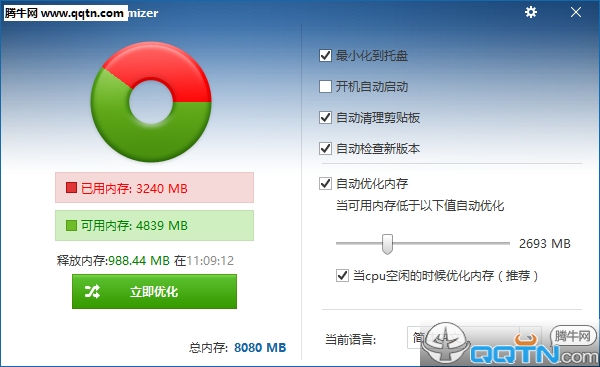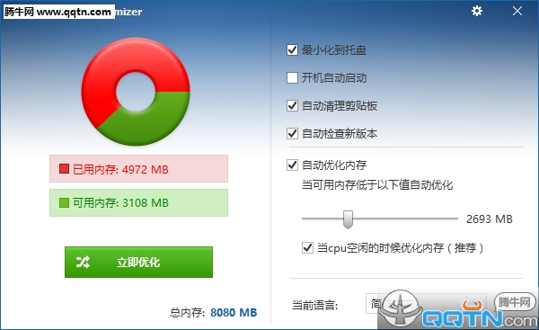 Wise Memory Optimizer支持最小化托盘、开机自动启动、自动清理剪贴板、自动优化内存。