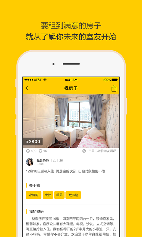 合租吧app可以在租房前就帮你找到和你在同一频道的小伙伴。你们可以一起做饭,一起看电视,一起撸啊撸,一起洗澡再捡块肥皂...