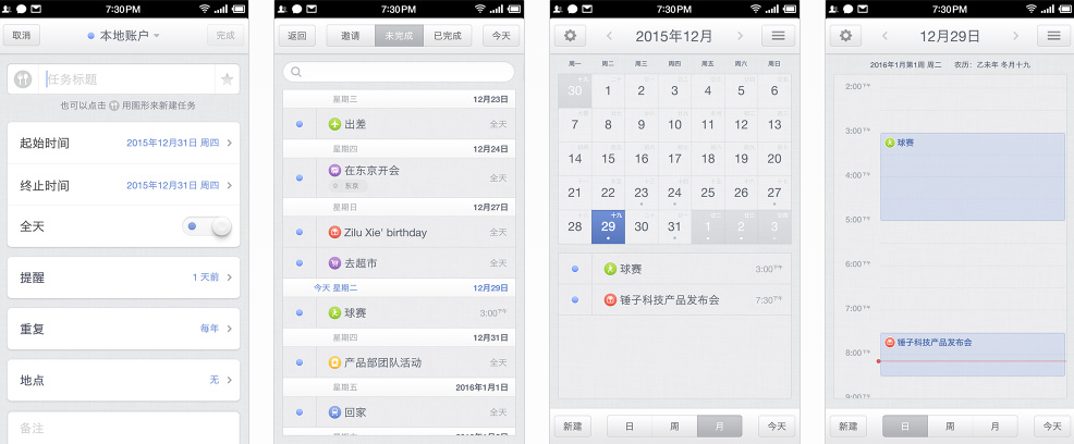 - 支持多账号同步:锤子日历支持与 Google 以及 Exchange 同步日历任务;