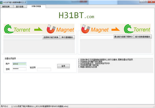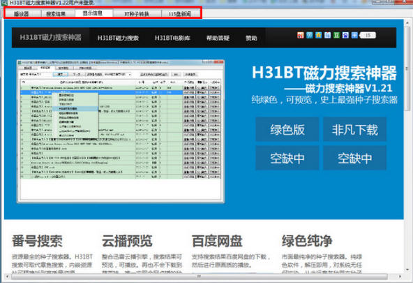 h31bt神器是一款整合了资源搜索、下载及云播放功能于一体的种子下载播放软件,可以进行磁力搜索,种子搜索,搜索质量远高于p2psearcher和章鱼搜索,搜索结果可直接到迅雷云点播、百度网盘、115网盘下载播放。软件提供BT种子直接转换等功能。