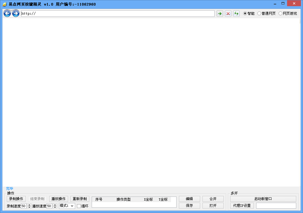 易点网页是一款专门针对网页的按键精灵软件,内嵌,支持普通网页,也支持网页游戏,本软件通过鼠标的移动,,鼠标点击,键盘按键等来操作网页,可以么模拟任何网页的操作,更多精彩内容欢迎下载体验。