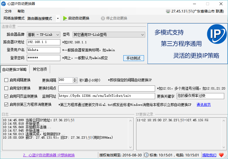 请在购买前先手动测试是否可换IP,或与我们联系远程协助调试,一般来说均可实现自动更换IP。