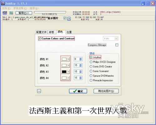 · 预设里选I-Author->选取Custom Colors and Contrast->把颜色#1-4全部选择成白色(#1-4分别代表字芯、字框、背景、消除走样,每个字幕的#1-4所代表的都不一样)->一一测试哪一个为字芯,设为黑色,其他3项全部为白色,重要!(参看附图)->点选确定