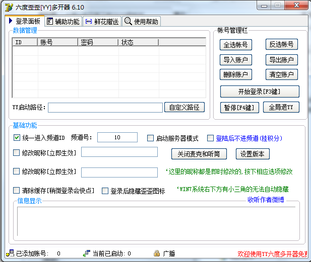 歪歪六度多开器(yy多开器官方下载)支持密码大小写.支持特殊符号.支持一键换频道.支持一键自动登录.登录速度超快,大幅度提升进频道准确率,90%无错误,密码错误自动登录,密码错误直接跳过,账号45秒无反应跳过.支持:YY6.4-V6.X版本。