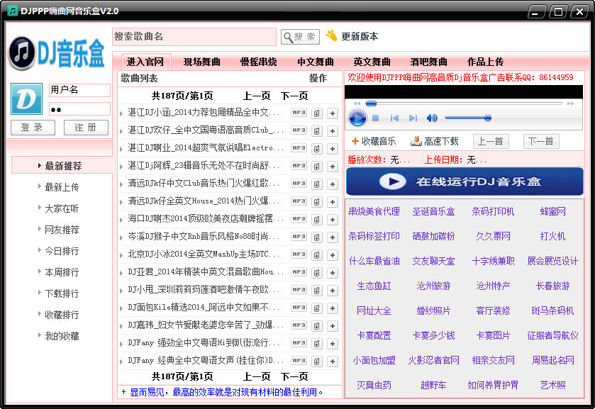 DJPPP嗨曲网音乐盒是中国用户数最大的免费DJ音乐盒,功能强大,点击即播,无缓冲,体积小巧,外形美观。下载DJ嗨曲网音乐盒即可拥有整个互联网的舞曲,并实时更新,让您的曲库永远最新最全!永久免费下载!