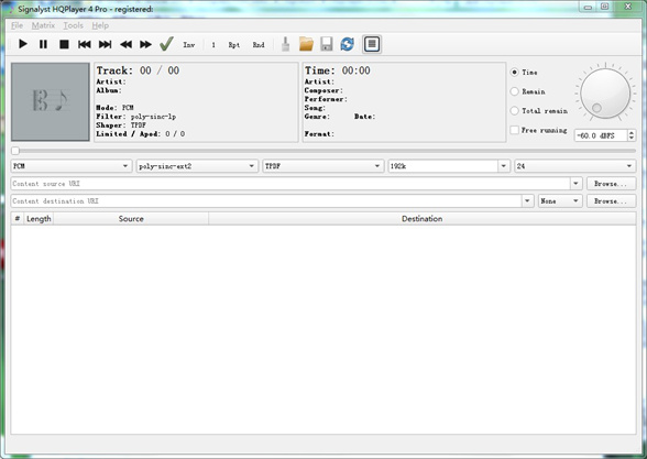 高质量的音频文件转换器,记录器和播放器。HQPlayer具有几个用户可选的高质量重采样器,以及用户可选的抖动/噪声算法和delta-sigma调制器。它主要用作制作各种格式的高质量最终发行文件的母带后期制作工具。任何受支持的源格式都可以转换为任何受支持的目标格式。例如,可以将Pyramix的DXD中间格式转换为PCM和DSD输出。