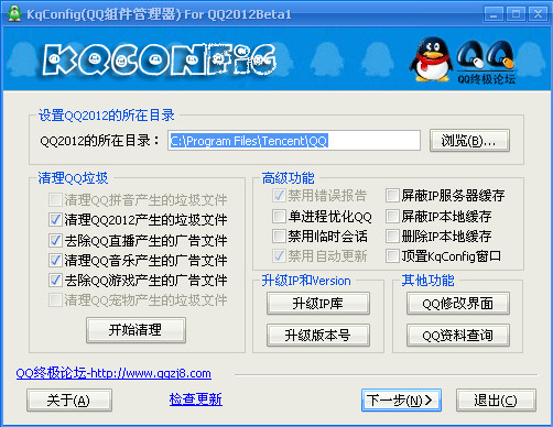KqConfig(Beta2 组件管理器)实现对QQ2012进行去广告,开启本地 会员功能,美化QQ等级图标及托盘图标,替换QQ声音,自定义QQ组件,清理QQ垃圾,自动 升级IP库,屏蔽QQ偷偷扫描硬盘,修改QQ界面,查询QQ资料……