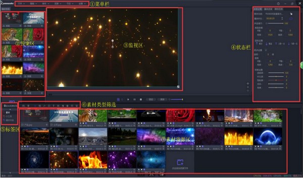 ③监视区、④状态栏、⑤标签区、⑥素材类型筛选、⑦素材资源区;