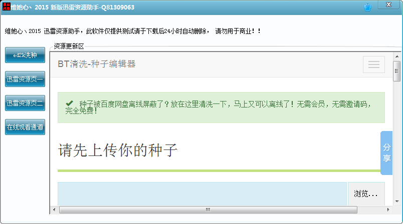 维她心2015新版资源助手是一款最新的迅雷资源搜索神器,这款搜索器拥有超强的搜索引擎,它简单好用,内置了多个迅雷资源获取点,点开即可播放视频。维她心迅雷资源助手为你实时更新片源,即点即播,同时此软件还有强大的洗种功能,即使是那些被迅雷屏蔽了的资源也能播放了!