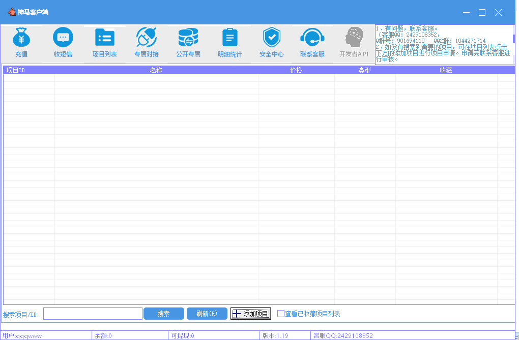 如没有搜索到需要的项目,可在项目列表点击下方的添加项目进行项目申请。申请完联系客服进行审核。